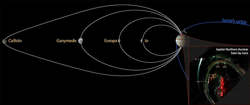 木星には、太陽系で最も明るく壮観なオーロラがある。極近くにあるこれらのきらめく光からは、木星が、木星の磁場に押し流された太陽風や月とどのように相互作用するかを垣間見ることができる。 |