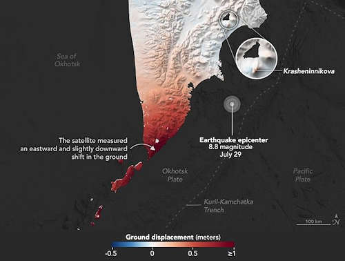 地質学者達は、干渉合成開口レーダー(interferometric synthetic aperture radar)を備えた衛星グループを使って、地震によって、地表がどの程度、どこに移動するかを検出することができる。 |