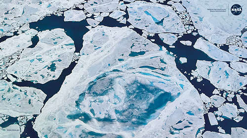 ![]() 海氷(Sea ice)とは、海に浮かぶ凍った海水のことである。この写真は、2022年7月21日に、NASAのガルフストリームV研究機から撮影されたもので、グリーンランド北部のリンカーン海の北極海の氷を示している。 |