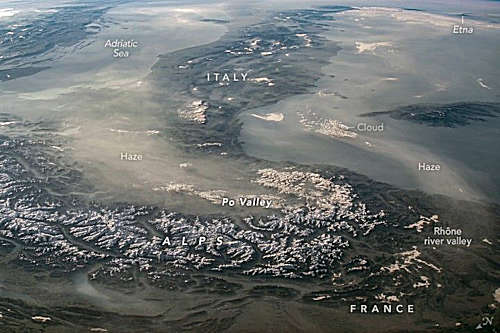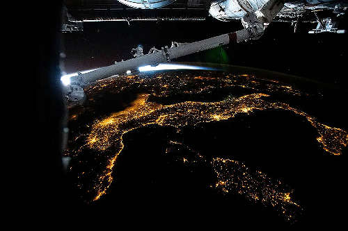 フランス領コルセ(Corse)島、イタリアのサルデーニャ(Sardinia)島、シチリア(Sicily)島を含む街の灯が、軌道上の日の出に向かって飛行する、地中海上空 261 マイルの国際宇宙ステーションから撮られている。前景には、国際宇宙ステーションのカナダ製ロボットアームCandarm2の一部がある。 |