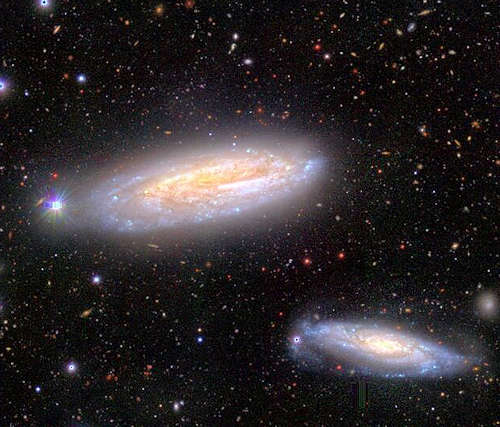 ![]() HSC の広い視野でとらえた宇宙の姿は、まさに壮麗です。このイメージで目を引くのは、2つの銀河、NGC 7537(右)と NGC 7541(左)でしょう。うお座の方向に位置するこの銀河ペアは、空の上ではおよそ 16 万光年離れて見えます。 |