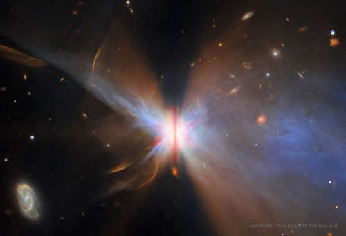 ミルキウェイ銀河の端に向かって、まだ形成中の若い星が、お祝いの花火の形で宇宙に誕生のお告げを送っている。 |