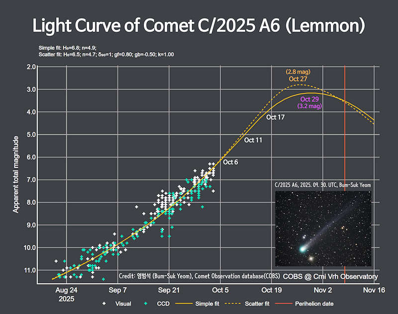 星間彗星 3I/ATLAS に注目が集まっているために、一般のスカイウォッチャーでもすぐに自分の目で見ることができるほど急速に明るくなっている局所的な彗星、レモン彗星 (C/2025 A6) を忘れがちである。「この彗星は非常に順調に発達しており、すでに印象的な天体であり、朝の空で観測するのに最適な場所にあります」と英国天文学協会のニック・ジェームズ氏は言っている。「間違いなく立ち上がる価値がある!」 |