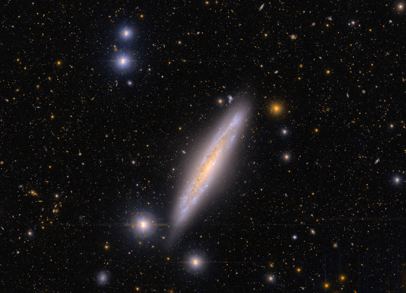 NGC 5301 は、りょうけん座の方向にある渦巻銀河です。円盤を真横(エッジオン)から見た姿で、銀河円盤全体に広がるダストレーン(暗黒帯)が際立っています。赤みを帯びた中心部と青く輝く渦状腕の色の対比が美しい銀河です。正面から見た渦巻銀河 NGC 5211 と比べると、同じ種類の銀河でも見た目の印象が大きく異なります。1つの銀河を異なる角度から見ることはできないため、様々な向きの銀河を観測し比べることが、銀河の構造を理解する上で重要です。 |