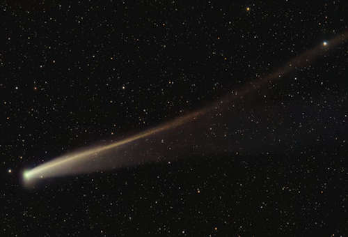 ほとんどの彗星は緑であり時には青である。カリフォルニア州のアマチュア天文学者のダン・バートレットが珍しい金色の彗星、アトラス彗星 (C/2025 K1) を追っている。 |