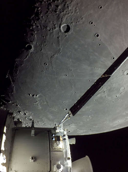 2022年12月5日、無人のオリオン宇宙船のカメラが、オリオンの、月からの帰還の際のフライバイの様子を捉えた。 |