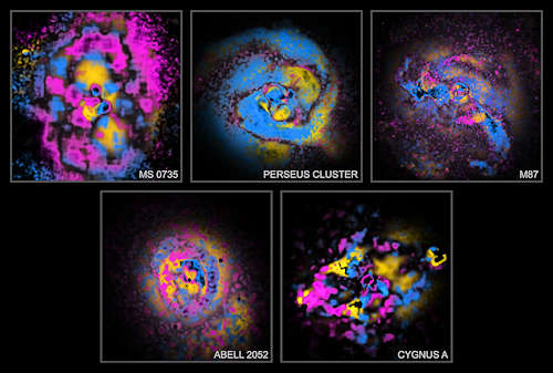 銀河団は宇宙で最も質量の大きな天体であり、重力によって結ばれ、数千の個別の銀河と巨大な超高温のX線放出ガスの貯蔵庫を含んでいる。この高温ガスの質量は通常、銀河団内のすべての銀河の総質量の約5倍ある。これらの可視の成分に加え、銀河団の質量の80%はダークマターによって供給されている。これらの宇宙の巨星は、銀河や星、ブラックホールのみならず、宇宙そのものの進化と成長の指標でもある。 |