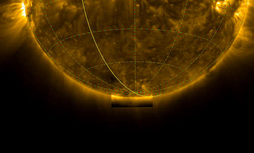 地球から見ると、我々は、常に太陽の赤道の方向を見ている。今年、ヨーロッパ宇宙機関主導の太陽周回ミッションは、この「標準的な」視点から抜け出し、軌道を17度傾けた。これは惑星や他の太陽観測衛星が存在する黄道面から外れている。 |