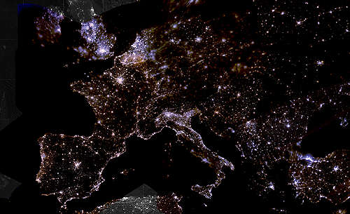 国際宇宙ステーションで撮影された7000枚以上の写真を組み合わせた合成に、ヨーロッパの夜が明るく輝いている。これは、これまでの宇宙のイメージを補正しカラーで制作された、初めてのヨーロッパの夜間のモザイクである。 |