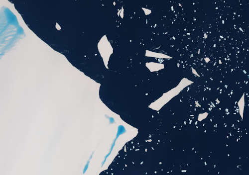 コペルニクス・センチネル2号の南大西洋上空のこのイメージは、かつて世界最大の氷山であったA23a氷山のクローズアップである。珍しく雲のないこのイメージは、間もなく氷山が完全に崩壊する最初の兆候を示している。 |