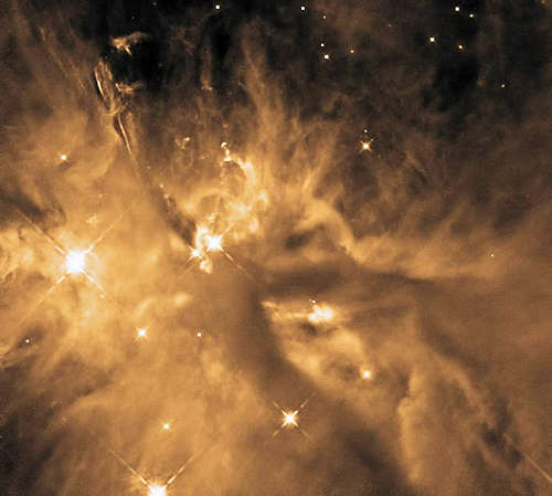 このハッブルイメージの左側にある明るい原星は、オリオン分子雲の中に位置している。星の風は、星の磁場によって刺激される放出され高速で流れる粒子で、周囲の雲に大きな空洞を刻み出した。右上には背景の星が点在している。