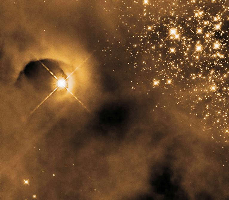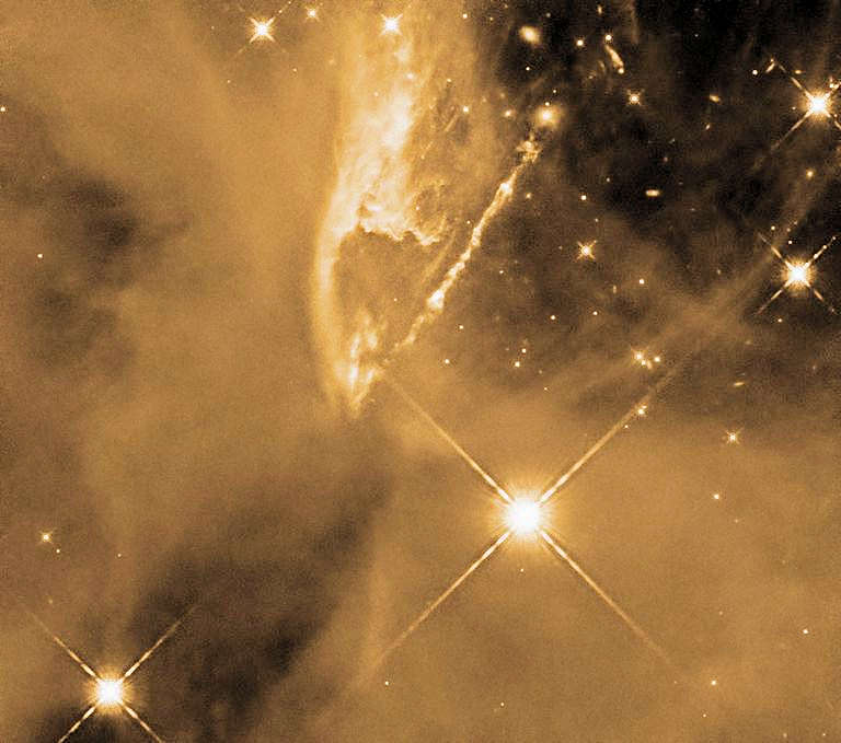 <イメージの説明>: このハッブルイメージでは、ガスの雲の中の曲がった空洞が原始星によって中空になっている。