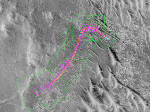 マゼンタの線は、ローバーがAI処理されたウェイポイントをたどる場合にローバーの車輪が進む経路を表しており、マゼンタの円で示されている。オレンジ色の線は、ドライブ完了後にダウンリンクされたデータに基づいており、実際にローバーが通った経路を示している。
