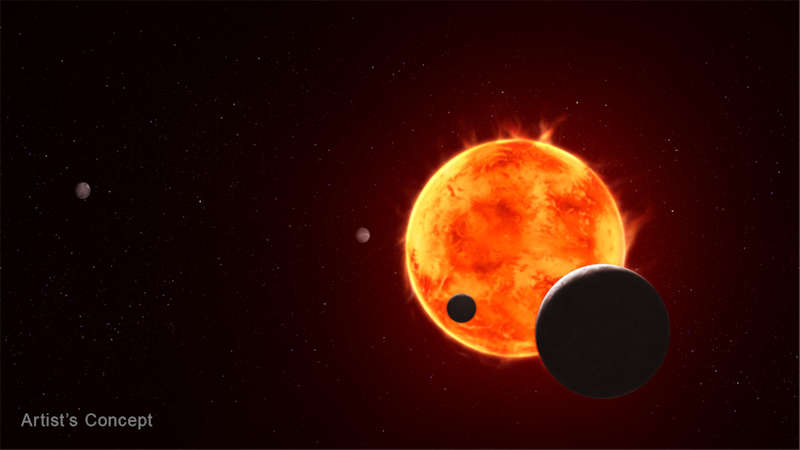 上に描かれている地球サイズの系外惑星TRAPPIST-1 eは、TRAPPIST-1システムのアーティストのコンセプトであり、燃え上がる主星の前を通過するときのシルエットを示している。科学者達は、この太陽系外惑星が恒星と望遠鏡の間を通過し、恒星の光が存在する場合の、その星の光が大気を照らすときに貴重なデータを収集できるこの出来事をトランジットと呼んでいる。
