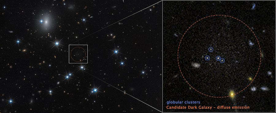 暗黒銀河の候補の一つを確認するために、天文学者達は、ハッブル宇宙望遠鏡、ESA(欧州宇宙機関)のユークリッド宇宙観測所、また、ハワイの地上設置型スバル望遠鏡の3つの天文台を利用した。ハッブルの高解像度画像により、3億光年離れたペルセウス銀河団に4つの球状星団が密集して集まっていることが明らかになった。ハッブル、ユークリッド、スバルのデータを使った追跡研究では、星団の周囲にかすかで散漫な輝きが見え、これは銀河の存在を示す強い証拠となった。