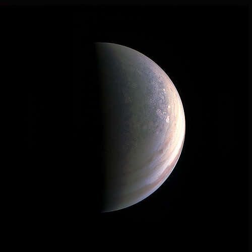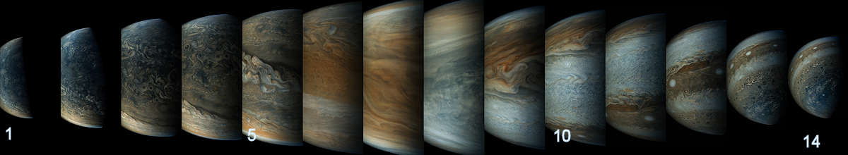 この拡張されたカラー・イメージのシーケンスは、NASAのジュノ宇宙船が木星に接近したときに、どれくらい急速に変化するかを示している。このイメージは JunoCam によってとられた。ジュノ宇宙船は、53日おきに木星に接近し、その雲の上を通過する。宇宙船は2時間で、木星の北極から最接近(perijove)を通して旅をし、その後戻る途中に南極上を通過する。このシーケンスでは14の拡張された色のイメージを示している。左の最初のイメージは、ほぼ北極を中央にした木星全半分が照らされた世界を示している。宇宙船が木星に近づいたときに地平線が入り、見える緯度の視界の範囲は減少する。このシーケンスの3・4番目のイメージは、北の中緯度の雲の波形の帯が視界に入るときの、我々の視界から回転して去る北極領域を示している。シーケンスの5番目のイメージでは、荒れ狂う雲の帯がイメージの中心に置かれている。7および8番目のイメージは、木星の赤道の近くの木星に最も近い点に宇宙船があった直前にとられた。これらの二つの写真がちょうど4分間隔でとられたが視界は急速に変化している。宇宙船が南半球を横切ったとき、9、10、11番目のイメージで明るい南の熱帯が支配している。12と13番目のイメージに、木星の「真珠の列」と名付けられた地形のホワイトオーバル(白い卵形)が見える。14番目のイメージで、ジュノは木星の南極を見ている。