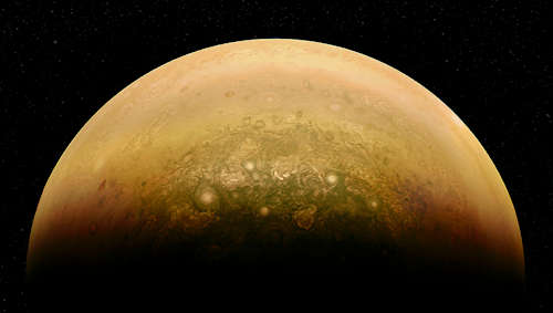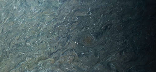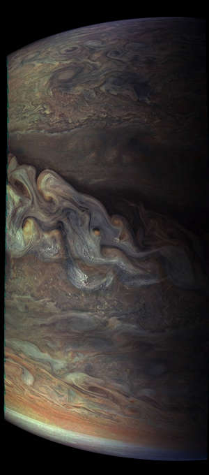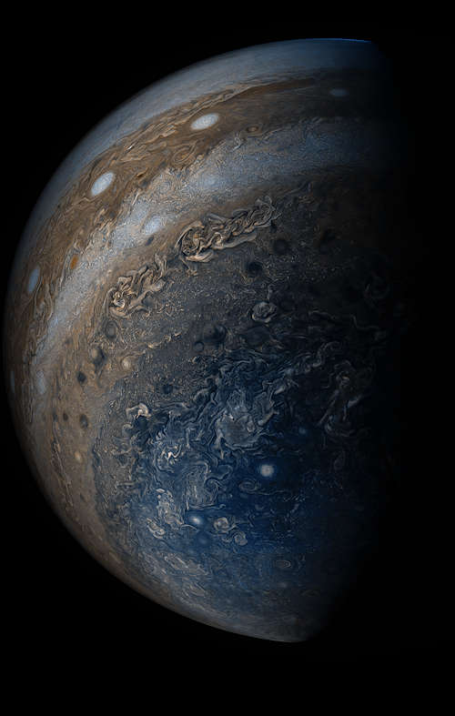 このイメージはNASAのジュノ宇宙船によって 52,000 キロメートルの高度から見られた木星の南極を示している。卵形の地形は直径 1,000 キロメートル以下の台風である。昼光、拡張された色、立体画法の投影で全エリアを示すために、3回の別々の軌道で JunoCam 装置でとられた複数のイメージが結合された。