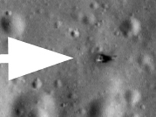 | サーベイヤ1号は二つの非常に異なる照明の下で「月偵察軌道船カメラ」によって描かれた。背景のイメージは地平線の上太陽が67度で獲得された。サーベイヤは矢印で示され上の差し込みに拡大されている。下の差し込みは地平線からの太陽が14度で描かれた同じサーベイヤを示す。 |