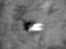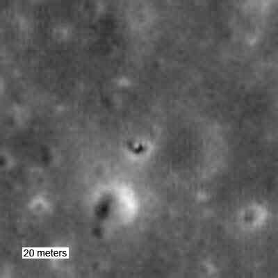 <右図>: 1970年4月14日、アポロ13号のサターン IVB の上段が北緯 -2.55 度東経 -27.88 度の既知の海の北で月に衝突した。直径約30メートルのインパクトクレータが「月偵察軌道船カメラ」の狭角カメライメージに明瞭に見られる。