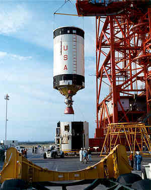 <左図>: サターンVの第3段が統合のために準備される。