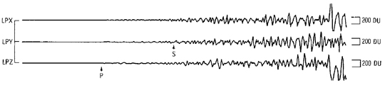 <右図>: ディジタルユニット(DU)のアポロ12号の地震ステーションで記録されたアポロ13号 S-IVB インパクト震動記象。この三つのトレースは長い波長での地面の動きの三つの直角のコンポーネントの信号を示している。矢印は初期 p と、より遅い二次的な s 地震波の到着を記録している。