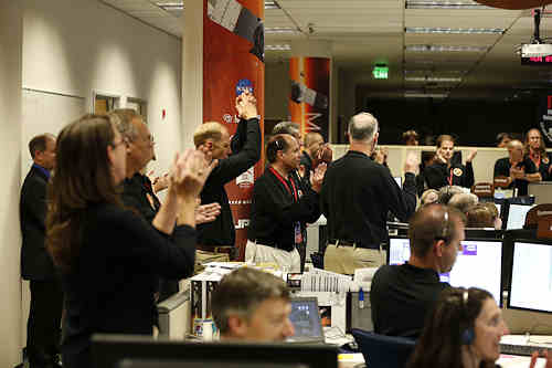写真は軌道入りの成功を喜ぶコロラドのロッキード・マーティンの MAVEN コントロール・ルーム