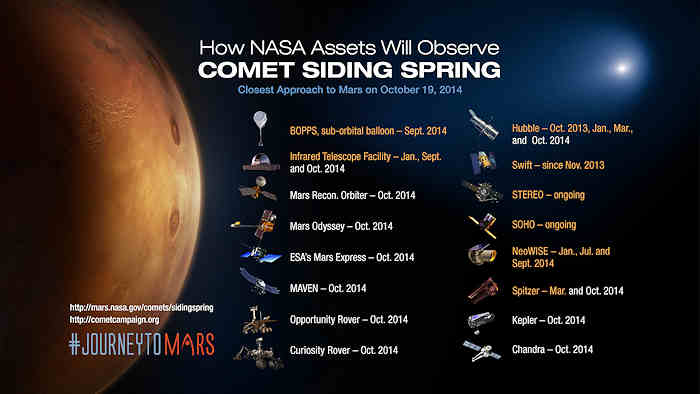 特に火星軌道を周っている、NASAの広範囲な科学資産の艦隊は、10月19日日曜日に生涯でただ一度の彗星接近飛行を調査する特別席を持っている。サイディングスプリング(Siding Spring)と呼ばれる彗星 C/2013 A1 は、地球と我々の月の距離の半分より近く、全ての既知の地球に接近した彗星の10分の一の距離より接近する赤い惑星の約 139,500 キロメートルを通るだろう。サイディングスプリングの核は東部夏時間午後2時27分(日本時間10月20日午前3時27分)ごろに火星に最接近し、秒速約56キロメートルで通過するだろう。この接近は、研究者達が、彗星と、火星の大気に対する影響に関するデータを集める、先例のない機会を提供するだろう。サイディングスプリングは、我々の太陽を囲む 5,000 〜 100,000 天文単位の間の宇宙を占めるオールトの雲から来る。この彗星は、科学者達に、46億年前の太陽系の構成の間に存在した、水と炭素混合物を含む素材について研究するかけがえのない機会を与えるオールトの雲からの初めての彗星になるだろう。彗星の接近飛行に備えて、NASAは、マーズ・オデッセイ軌道船、火星偵察軌道船(MRO)、火星大気揮発性進展(MAVEN)軌道船を注意深く運行するだろう。軌道を周っている宇宙船の最も大きな危険の期間は、彗星の核の最接近の約90分後に始まり、火星が彗星の核から飛んでくるダストの広がる尾の中心に最も近くなる20分間続くだろう。 --- 以下略