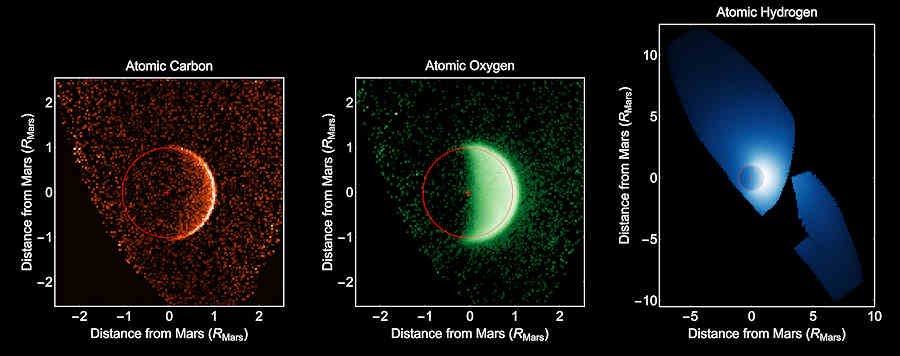 「これらの観測によって、メイブンの IUVS は、これまでに行なわれた広がった火星の超高層大気の最も完全な写真を得た」と、コロラド大学のメイブン遠隔探査チーム・メンバー Mike Chaffin は言った。「惑星の広がった超高層大気を測定することによって、メイブンは、直接、これらの原子がどのように宇宙に逃げたかを徹底的に調査する。これらの観測は、金星や地球と比較して、火星の超高層大気が、赤い惑星の弱い重力によってのみ、弱く縛られているという我々の現在の理解をサポートしている。」