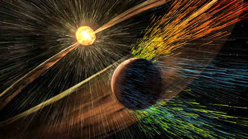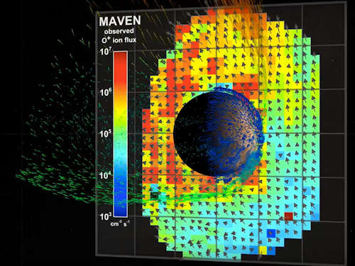 今日、火星は冷えて不毛な砂漠であるが、科学者達は古い過去には暖かく湿っていたと考えている。初期の火星の大気の消失がこの劇的な変化に結びついたのかもしれず、その主要な容疑者の一つは太陽風である。地球とは異なって、火星は、連続的に太陽から吹きつける帯電した粒子の流れを逸らす広域な磁場に欠けており、太陽風は火星の超高層大気と衝突して宇宙にイオンを推進する。今、NASAの MAVEN は、火星から逃げるイオンの速度と方向を測定することによって、初めて活動中のこのプロセスを観測した。この視覚化されたデータは、 MAVEN によってとられた新しい測定を使って、太陽風と火星の大気の逃亡のシミュレーションを比較している。