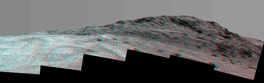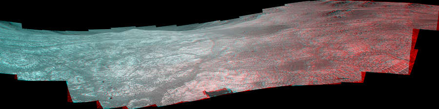 火星の「オリオン・クレータ」のこの視界は、NASAの火星探査ローバー・オポチュニティのパノラマカメラ(Pancam)の左目と右目のレンズからのイメージを結合している。赤・青眼鏡を通してみたときに3次元で見ることができる。