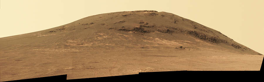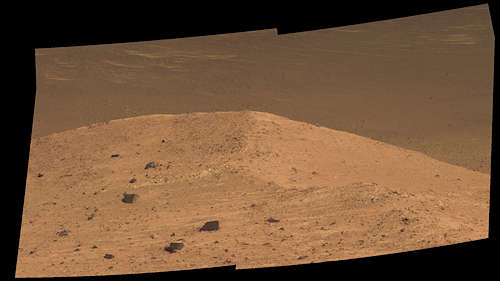 NASAの火星探査ローバーオポチュニティのパノラマカメラ(Pancam)からのこの光景は、エンデバークレータのフロアを見渡す「スピリッツマウンド(Spirit Mound)」を示している。このマウンドは、クレータの西の縁の「ビタールート(Bitterroot)谷」の東端近くにあり、東の方向に向かっている。スケールの参考として、中央下の2個の岩はそれぞれ差渡し約20センチメートルである。マウンドの頂上ラインのイメージは幅約 8.5 メートルのエリアをカバーしている。この合成のための構成要素イメージは火星日 4,501 日(2016年9月21日)にとられた。各露出は、 753 ナノメートル(近赤外線)、 535 ナノメートル(緑)、 432 ナノメートル(紫)の、パノラマカメラの三つのカラーフィルタを通してとられた。この光景はほぼ真の色で示されている。ローバーの科学チームがこの地形のために選んだ非公式の名前はサウスダコタのスピリッツマウンドを指している。チームは、ルイスとクラーク遠征(Lewis and Clark Expedition)によって訪問された、その遠征がモンタナを訪ねた谷にちなんで、非公式の名前として火星のビタールート谷の名前を使っている。