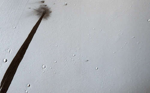 NASAの火星偵察軌道船(MRO)からこの HiRISE イメージは、斜面の筋をつくり出した、新しい、約10年以内のインパクトクレータを捕えている。流星体が地表を打ちクレータをつくるために爆発したとき、それはまた、斜面を不安定にし、この雪崩を引き起こした。このクレータ自体は僅か差渡し5メートルであるが、その筋は長さ1キロメートルある! 斜面の筋は、乾いたダストの雪崩がダストの丘の上に暗い帯を残すときにつくられる。古い雪崩の色あせた傷跡が、また、この新しい暗い筋の側に見える。