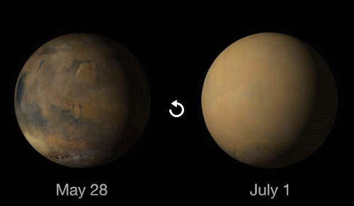 NASAの火星偵察軌道船(MRO)の火星カラー画像(MARCI)カメラによるこのムービーは、どれほどのダストが赤い惑星を囲んだかを示している。5月からの視界は、マリネリス峡谷(左)、メリディアニ(中央)、アシダリア(上)の秋のダストの嵐、早い春の南の極冠(下)を示している。7月からの視界は同じ領域を示しているが、地表の大部分は惑星を囲むダストの雲と霞によって隠されている。