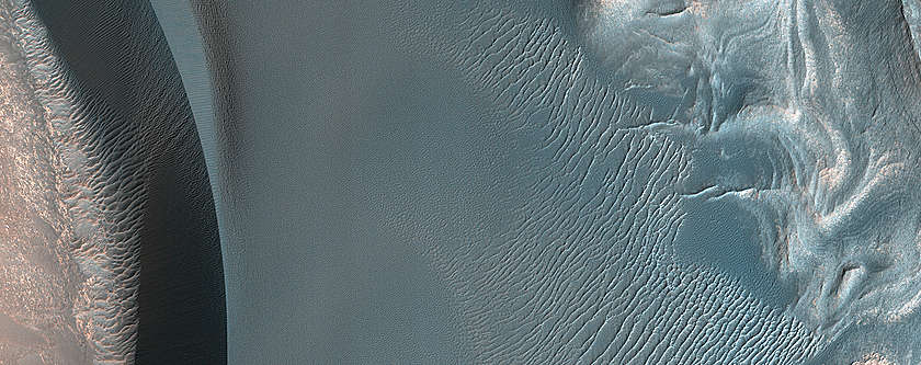 NASAの火星偵察軌道船がこのイメージを得た火星の夏の初めには、砂丘は季節の氷でほとんど覆われていなかった。一日のほとんどが陰になる氷のポケットのみが保護されて残っている。火星の北極は砂丘の広大な海に囲まれている。この砂丘フィールドでは、砂丘は、冬にはドライアイスの季節のキャップで覆われる。