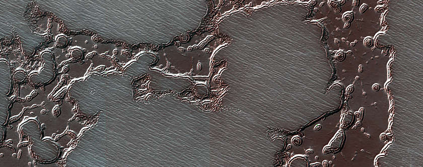 NASAの火星偵察軌道船(MRO)からのこのイメージは、中央にクレータを持つ丘を示している。このような地形は、二つの泥の火山(実際には堆積構造)、および実際の火山(噴出している溶岩の種類)と解釈された。それらは、湖を開いたかもしれない閉じた地形の輪郭の下に、また、湿った堆積物の圧縮が泥火山をつくったかもしれない、マリネリス峡谷のフロアに起きている。この丘を囲む明るい流れのユニットの破砕のパターンは泥の亀裂に似ている。しかしながら、また、この場所ではそうとは限らないが、実際の火山活動を示唆する高温ミネラルと解釈される火星コンパクト偵察画像分光計装置(CRISM)からの観測もあった。この丘の微細な層は火山活動か泥流と一致している。どちらにしても、この活動は、地質年代として比較的新しく、ハビタブル(生物居住可能)な地下の環境を記すのかもしれない。このマップはピクセルあたり50センチメートルのスケールで投影されており、北は上である。