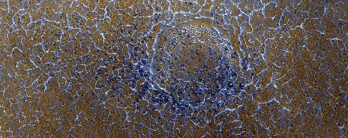火星の冬は二酸化炭素の雪の覆いとともに来る。春の「雪解け」の間に、パターン化した地面の多角形のトラフのような浅い窪地に長い線を引いて、この雪は大気の中に蒸発する。改良されたカラーは、この二酸化炭素の雪を、さびた赤裸の地面のエリアの間に青白い片として示している。このイメージは、2008年に、その同じ年の後に火星に到着したフェニックス着陸船の着陸地点として、このイメージをとった。
