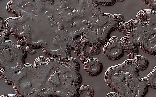 火星の北極の層になった堆積は、氷の層の厚い積み重ねから成っている。NASAの火星偵察軌道船(MRO)からのイメージのこの一部は、それらの層を強調する長く残った季節の霜を持っている。この観測の新しい理論的解釈は、斜面の浸食の新しい活動の記録である。このマップはピクセルあたり50センチメートルのスケールで投影されており、北は上である。