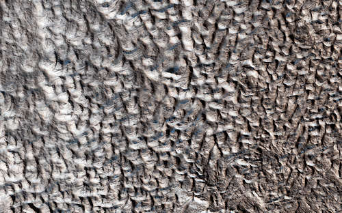 これは、季節のプロセスの追跡の、新しい監視シリーズの最初である。それは、また、ダストと混ざった二酸化炭素の霜によって覆われた砂丘を角度をもって照らした晩冬の、驚くようなイメージでもある。これらの暗い場所は、非常に早い解凍の動きから砂が露出した場所かもしれない。照明の角度は87度または地平線から3度である。このマップはピクセルあたり50センチメートルのスケールで投影されており、北は上である。