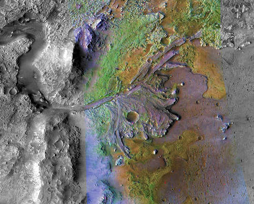 このイメージは、NASAのマーズ2020ミッションの着陸地点候補、火星のヤゼロ(Jezero)クレータである。これは、将来のミッションのために定期的に潜在的着陸地点のイメージをとっている、NASAの火星偵察軌道船(MRO)の機器によってとられた。古代の火星では、水はチャンネルを刻み、扇型とデルタをつくり、堆積物を湖の中に運んだ。軌道からとられたスペクトルデータの検査では、これらの堆積物のあるものが水による化学物質の変化を示す鉱物を持つことが示されている。ここ、ヤゼロクレータのデルタでは、堆積物は粘土と炭酸塩を含んでいる。このイメージは、 MRO のコンパクト偵察画像分光計(CRISM)とコンテキストカメラ(CTX)の、二つの機器の情報を結合している。