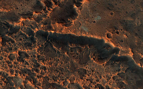 火星の未解決のミステリーの一つがここに見られる。「脳の地形(brain terrain)」と呼ばれる相互に接続した隆起とトラフのこの地表の模様は、火星の中緯度領域を通して見ることができる。このイメージはプロトニルス・メサ(Protonilus Mensae)である。この異様な模様の地形は、地下に横たわる水の氷に直接関連があるかもしれない。一つの仮説は、埋められた水の氷が昇華するとき、氷に窪みを形成するというものである。これらの地形の構成は、 HiRISE がまだこれらの地形の重要な変化を検出していない時からの活動的なプロセスかもしれない。このマップはピクセルあたり25センチメートルのスケールで投影されており、北は上である。