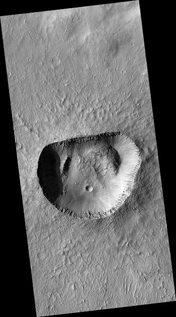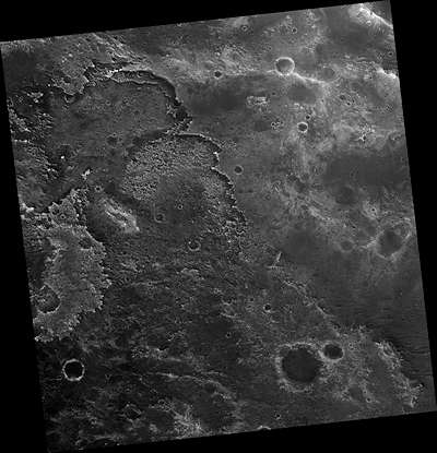 大部分のクレータは全方向に広がる高速のインパクトが強力な爆発のように働くので丸い。しかし、このクレータは北の縁がほぼ完全に直線であり例外である。一つの可能性は、インパクトの前に存在した地殻に、接合部または断層の地帯があったことである。インパクトが起きたとき、このクレータは、これらの断層の直線に沿って形づくられた。ある類似したことがアリゾナの流星クレータに起きた。我々のイメージにはいかなる断層も示していないが、これらは表面の下にあるのかもしれない。恐らくある種の不平等な崩壊が、クレータの形を変えたのだろう。特に北西と北東の角のクレータのフロアに素材の山がある。もしこれらの堆積が縁から落ちたのであれば、何故他の場所ででなくそこで起きたのであろうか? このクレータは、大きなクレータが壁の落下やテラスを示し始める大きさに近く、それ故、この種の崩壊が不規則に起きているのかもしれない。我々のイメージは、外側の周辺や内壁の個々の巨礫とともに、クレータの縁のはっきりした詳細を明らかにしている。そのことは、このクレータが恐らくあまり古くないことを、従ってそれは激しく変形されていないことを示している。我々は未だ正確な理由を知ってはいないが、この奇妙な形は、恐らく、それが最初に形づくられたときに起きたのだろう。このマップはピクセルあたり50センチメートルのスケールで投影されており、北は上である。