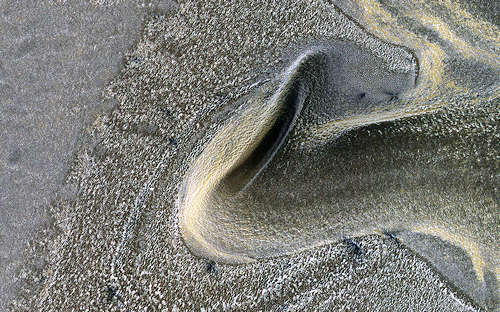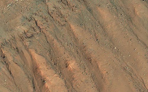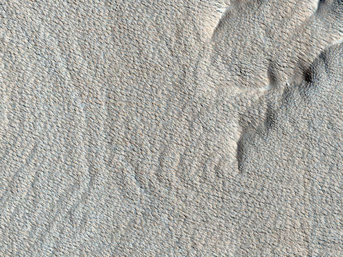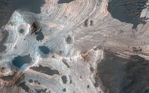このイメージの表面は海のように波打って見える。これらの波形は数百または数10億年の浸食の結果である。この浸食は恐らく風の働きによって行なわれ、古い過去にこのエリアに置かれた層になった岩を明らかにした。これらの層は非常に規則的に堆積し、浸食がこれらの巨大なうねりをつくるように、ある時は浅くある時は深く、それらを横断して切った。更に抵抗力のある層は一層突き出ており、波頭をつくっている。