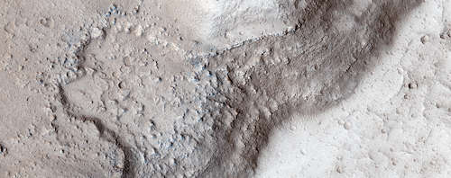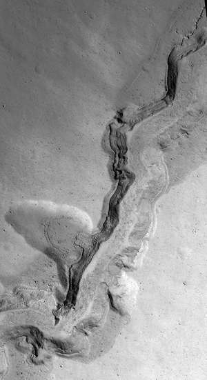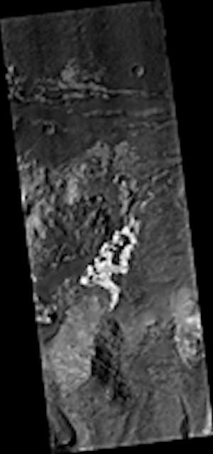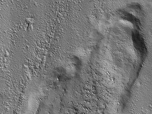 このイメージは、イアニ(Iani)カオスの小さな地滑りを示している。多数のマウンドや丘があるこのエリアを含めて、急峻な斜面がある地滑りは火星では一般的である。この地滑りについて珍しいことは、それが動いたときに下り斜面にその経路を彫ったことである。このイメージは、科学者達がその形成のメカニズムを理解するために、3Dで地滑りを調べられるようにしたステレオ・ペアの一部である。このマップはピクセルあたり25センチメートルのスケールで投影されており、北は上である。