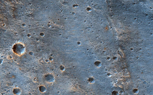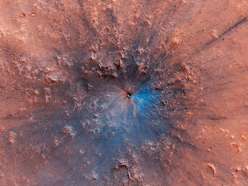 これは、恐らく2016年9月と2019年2月の間に火星の地表に現れた、新しいインパクトクレータである。これを際立たせているものは、赤いダストの下に露出している暗い素材である。素材の組成の違いを強調するためにいくつかの色フィルタを結合したこの疑似カラーイメージでは青く見えている。明るい青は明るく赤いダストの欠如を示し、そこではインパクトの爆発が地表を破壊し、下の基盤を明らかにしている。非常に明るい青はインパクトによって投げ出された異なる組成を持つ排出物であろう。この青い色は氷ではない。このインパクトは赤道に近く、我々が地下に浅い氷を期待する領域ではない。