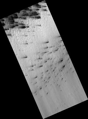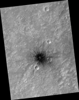HiRISE は、 MRO のコンテキストカメラで発見される、ほとんどが新しいインパクト・サイトである新しい暗い地形を撮ってきた。この場面には、新しいインパクト集団にある、クレータから下の方へ広がる新しい暗い斜面の筋を見ている。これらの斜面の筋は乾燥したダストの雪崩によって形づくられる。我々は、また、以前の場所に新しいインパクトと関連する大きな新しいダスト雪崩を見ている。このマップはピクセルあたり25センチメートルのスケールで投影されており、北は上である。