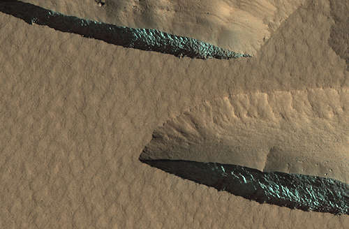 NASAの火星偵察軌道船(MRO)に搭載された高解像度画像科学機器(HiRISE)カメラは、2009年2月9日にこれらの砂紋と大きな砂丘(中央)を捕えた。色はより見やすくするするために加えられている。このエリアは、南緯 47.8 度東経 30.7 度の、プロクター・クレータの中にある。 HiRISE はアリゾナ大学によって運用されている。