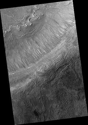 このイメージは、インパクトクレータの壁の頭に沿った、いくつかの暗い流れの幽かな跡を示している。これらは、赤道に面した斜面につくられる季節ごとに繰り返されている斜面の線(RSL)の名残である。これらは、これまで活動的であるとは期待されなかったので、我々は、どのような変化に対しても、火星の春の後期まで待たなければならないだろう。しかしながら、それらが季節を通して進むので、また、RSL を形成した全てを以前にこのサイトで確認してきたので、我々はこれらのサイトを監視することを望んだ。それは、このクレータ壁のように、 RSL が同じ場所で各火星年ごとに繰り返されるからである。
