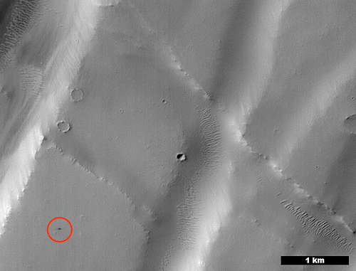 このイメージの左下隅の赤い円の中の小さな黒い点は、新しい機械学習アルゴリズムを使って火星に発見された最近形成されたクレータの集団である。このイメージは、NASAの火星偵察軌道船(MRO)の概況(context)カメラによって、緯度 3.213、経度 259.415 にあるノクティス(Noctis)フォッセと呼ばれる領域でとられた。この中間角度のコンテキスト(概況)カメラは、低解像度で、何百マイルもの地勢を見ることができる。科学者達は、イメージに興味深い地形を求めてスキャンし、また、他の MRO のカメラ、高解像度画像科学装置(HiRISE)に、更に詳細な視界のためにズームインすることを求めることができる。このイメージの黒い小さな点の HiRISE の視界には、火星のクレータの集団の AI の場所、 HiRISE の視界を見ることができる。