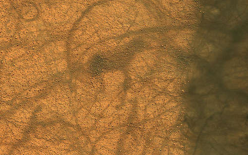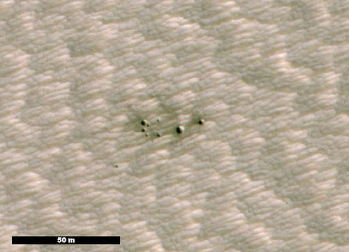 このイメージはマンガラ峡谷近くの地勢を示している。イメージの下の二つの黒い部分は最近のインパクトクレータである。これらの黒い場所は、クレータが、明るいダストの表面の下の素材を露出させたことによって形成された。このイメージは、また、表面が風の活動によってつくられた、クロスするパターンを持っているので興味深い。右上から左下への明るい波紋は風の流れに対して直角をなしている。対照的に、風によって浸食された露岩は、我々が今観測しているクロスするパターンをつくって波紋に対して直角をなしている。このマップはピクセルあたり25センチメートルのスケールで投影されており、北は上である。