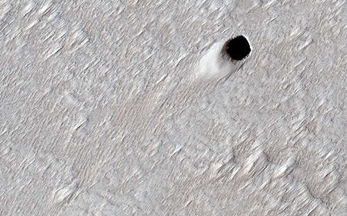 あるタイプの溶岩は、古い岩の下を押し進み、それを持ち上げて地下を流れ続けることがある。溶岩の大きな地下の川はこのようにして形づくられ、火山が噴火を止めたとき、溶岩がこれらの地下のチューブから排出されることがある。これらの空の地下チューブは地球上では一般的であり、火星の巨大な火山、このアルシア・モンズの山腹のような場所では縦横に走っているのかもしれない。このイメージにおける溶岩チューブの天井が、ある場所で崩れ、この穴のクレータを作った。この穴は差渡し約50メートルあり、従って、地下のチューブは、地球の似た洞穴より非常に大きく、少なくともこの大きさである可能性がある。 HiRISE が頭上を通る午後遅くには、いつも内部が陰になっているので、これらの急な穴を調べることができない。このマップはピクセルあたり25センチメートルのスケールで投影されており、北は上である。